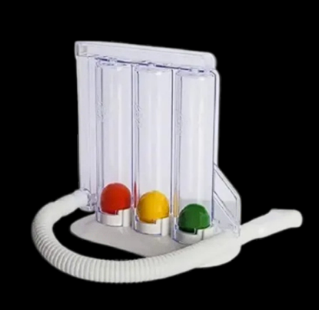 Three-ball incentive spirometer designed to encourage sustained deep breathing, expand lung volume, and prevent post-operative pulmonary complications such as atelectasis and pneumonia. Suitable for respiratory therapy in hospitals and home care.